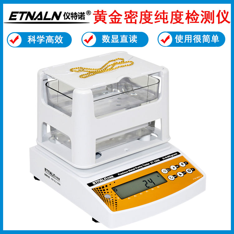 黃金密度計_貴金屬純度檢測儀_黃金首飾檢驗真假的儀器,ET-320K,ET-600K 、ET-1200K系列產(chǎn)品屬升級換代產(chǎn)品,相對于其它競爭產(chǎn)品,本系列產(chǎn)品重點提升了稱重精度,簡化了操作步驟與方式,升級了軟件的應用功能,使得測量結(jié)果的可靠性得到進一步提高;并分別具有黃金、鉑金、銀三個含量測量模式及一個合金測量模式。