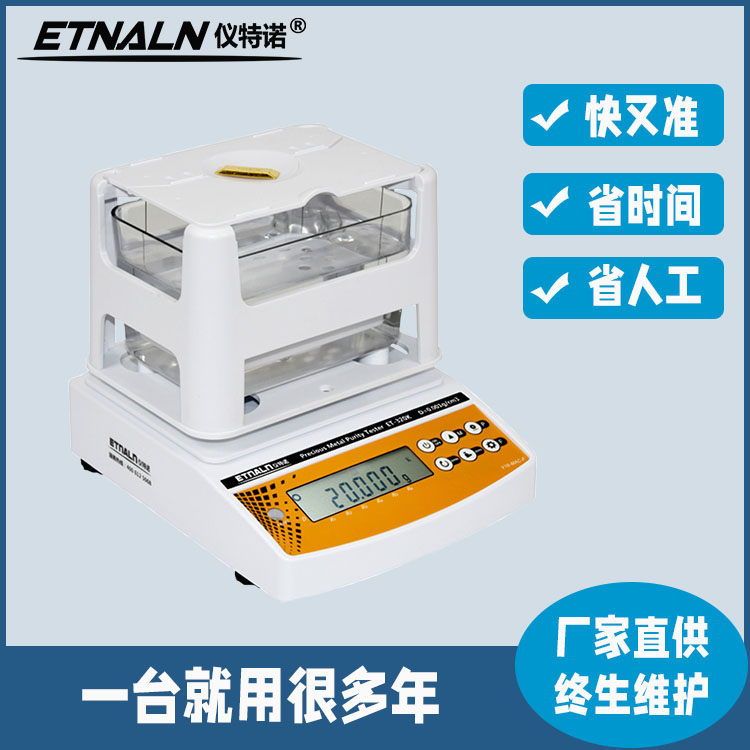 儀特諾黃金密度計_貴金屬純度檢測儀_黃金首飾檢驗真假的儀器ET-320K、ET-600K 、ET-1200K,無需捆綁測試樣品,僅兩個步驟:先測量空氣中重量,按ENTER鍵,再放入水中測水中重量,按ENTER鍵,即可準(zhǔn)確、快速的顯示黃金K值、%含量、密度值;如果是測鉑金,即2步直接顯示鉑金PT值、%含量、密度值;或測銀就直接得出銀S值、%含量、密度值;也可以測量黃金或及其它合金的%含量、密度值。