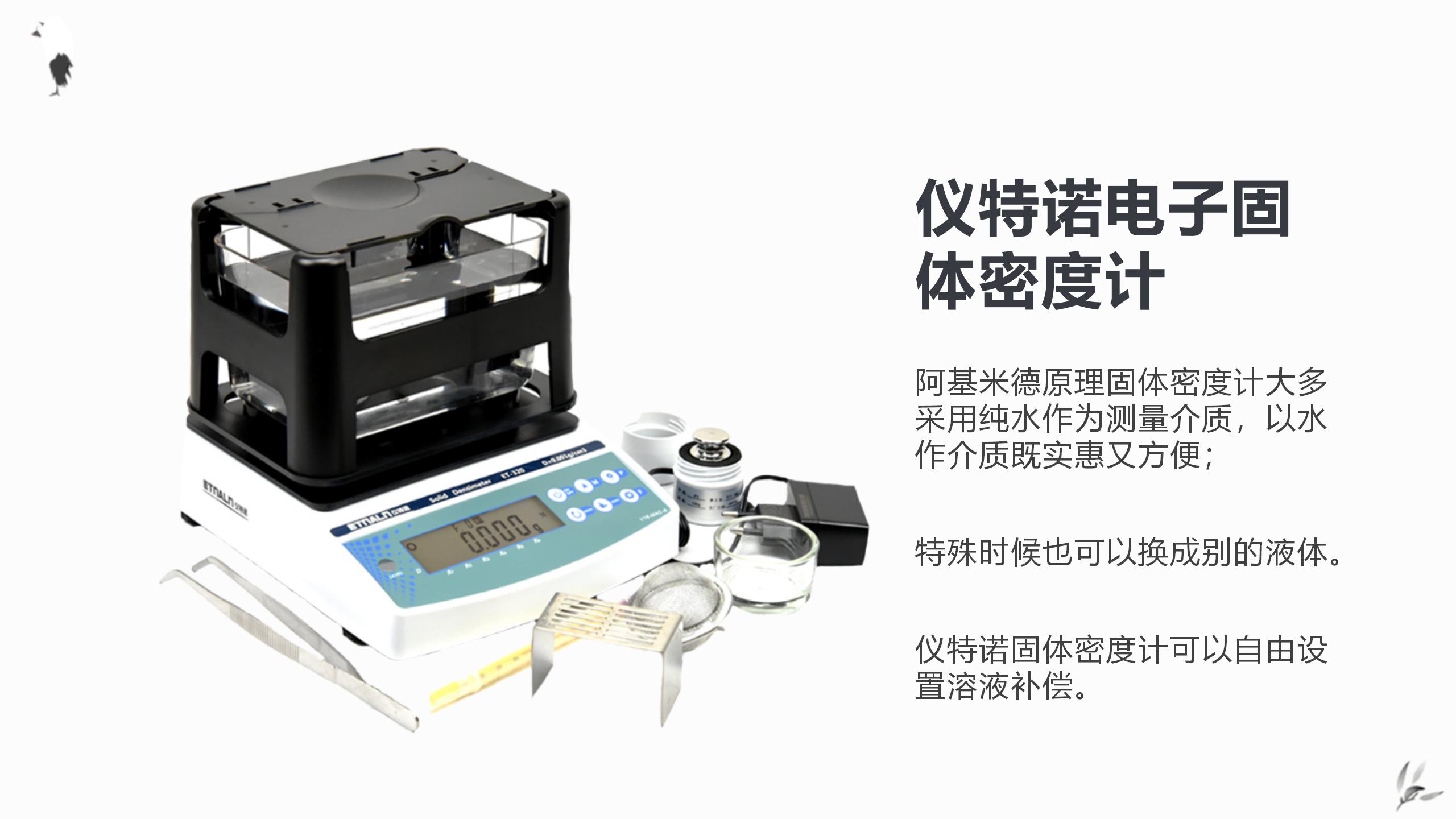 儀特諾固體密度計(jì)的其中一個(gè)亮點(diǎn)在于,它可以自由設(shè)置溶液補(bǔ)償,更換酒精、硅油等其它介質(zhì)來(lái)進(jìn)行測(cè)量,這一設(shè)計(jì)為要測(cè)試的產(chǎn)品會(huì)溶于水的用戶提供了極大的便利。