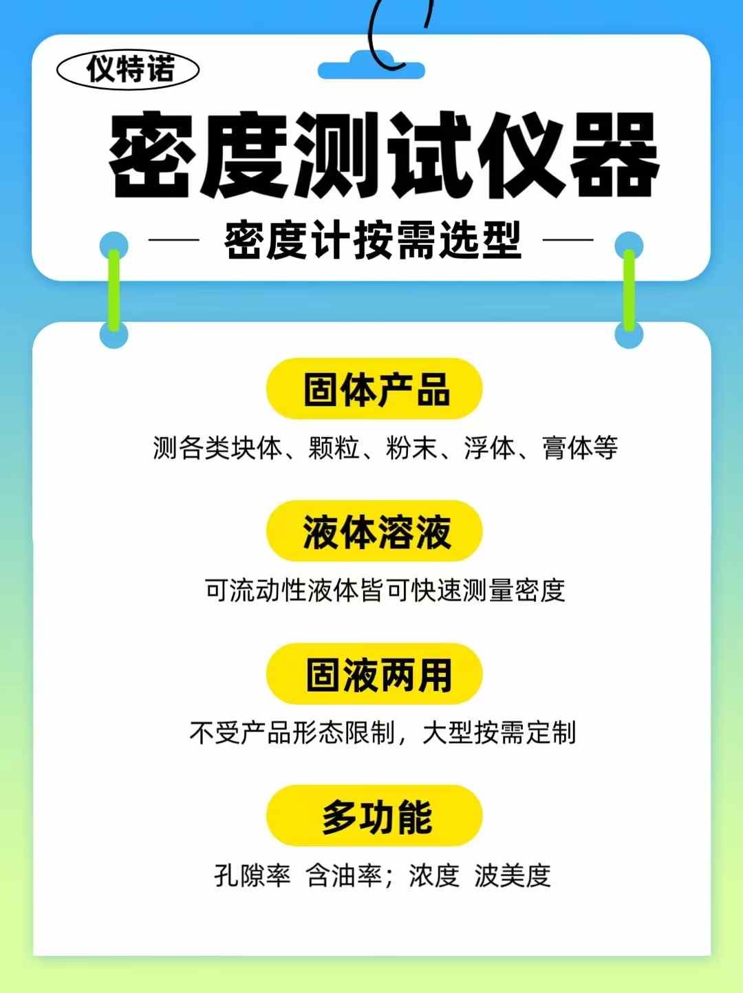 除了高粘度液體,儀特諾液體密度測量儀系列儀器還可測量流動性液體、揮發(fā)性液體、腐蝕性液體、高溫液體、懸浮液、乳化液、酸堿液體等,滿足各類液態(tài)溶液的密度檢測需求,并符合GB/T 611 、GB/T 5526 、GB/T11540、GB/T29617-2013、GB/T12206、GB/T5518等國家標(biāo)準(zhǔn)。